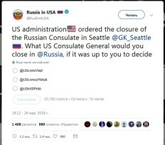В Twitter посольства РФ в США предлагается проголосовать, какое из американских консульств в России следует закрыть — во Владивостоке, Екатеринбурге или Санкт-Петербурге.