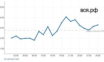 Доллар США: 1 июня за один доллар платили 62,0188 рубля. К 29-му числу американская валюта подросла до 63,2910 рублей. Минимальная стоимость зафиксирована 8 июня (61,8125 руб.), максимум – 20 июня (64,0683 руб.).