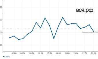 Евро: торги в начале месяца начинались с отметки 72,5806 руб. На 29 июня цена составила 73,0884 руб. Минимальный показатель наблюдался 5 июня (72,4384 руб.), максимальный – 20 июня (74,1847 руб.).