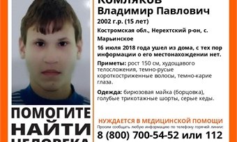 В СК Рф по Костромской области рассказали, что 15-летнего Вову Комлякова, который пропал вчера — обнаружили в Нерехтском районе. Мальчик ушел из села Марьинское, а домой так и не вернулся. Повсюду были даные ориентировки и приметы подростка.