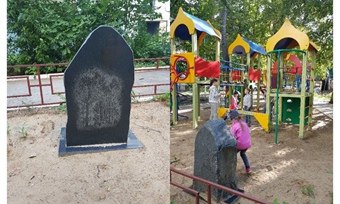Это не шутка. Дети играли рядом с могильной плитой местному авторитету Беркутову, как память «лихим» 90-ым. Вероятно, плиту установили товарищи по криминальной романтике. Памятник стоял несколько лет, пока жители не обратились в правительство области. После того, как в это дело вмешались СМИ, на площадку приехал известный депутат Александр Хинштейн, который пообещал убрать арт-объект в понедельник, но кто-то подсуетился и сделал это раньше. По всей вероятности, демонтировали скульптуру наследники Беркутова, только стражам порядка даже в голову не пришло проследить за этим моментом. Да и все эти годы никто не наблюдал за памятником.
