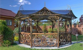 По сравнению с деревянными, металлические кованые беседки обладают повышенным сроком службы, такую беседку легко задекорировать текстилем или растительными элементами, что придает небольшому строению особый уют. Металлу кованой беседки не страшны порывы ветра, резкие перепады температуры и влажности, вредоносные воздействия насекомых-древоточцев, его можно запатинировать или придать эффект старины.