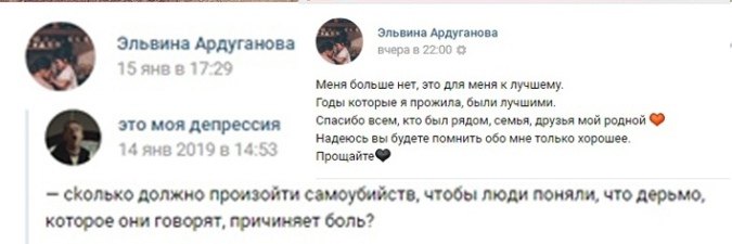 К слову, Эльвина недавно потеряла родителей. На Новый год, она пришла поздравить будущих родственников, но несостоявшаяся свекровь выгнала ее, сказав, что ребенка девушка «нагуляла». Группа Плохие новости пишет, что согласие на свадьбу, они обещали дать только, если она докажет, что это их сына ребенок. Разговор с матерью парня был и по телефону. Этим же вечером девушку нашли мертвой. Вероятно, будет заведено дело по статье «доведение до самоубийства».