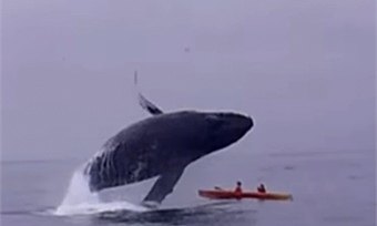 Они плыли на каяке в заливе Монтерей, в тот момент, когда гигантский 30-тонный кит внезапно вынырнул из воды, буквально, воспарив над людьми.