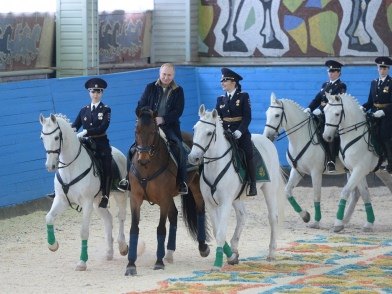 Личный состав полка продемонстрировал свои умения и навыки. Затем состоялась совместная конная прогулка Главы государства и полицейских кавалеристов по манежу.