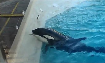 Косатка Калия приманивает птиц рыбой, а потом ловит их, сообщает Гисметео. На записи видно, как она выплевывает малька у самого края бассейна. Птицы сначала не решаются подойти, но одна не выдерживает и тянется к рыбе. Тогда ее хватает терпеливая косатка. Косатки находятся в самом верху пищевой цепи. При охоте они используют очень сложные схемы и стратегии.