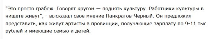 Актер признается, что на еду денег хватает, а вот на развлечения и поездки на море — уже нет. Также Панкратов-Черный заявил, что много средств уходит на оплату жилья, в результате чего «лишних» денег остается катастрофически мало.