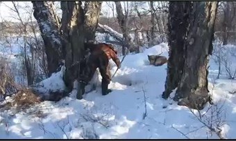На кадрах видно, как живодер раскапывает палкой лаз берлоги, вокруг беснуются собаки. Проснувшийся косолапый едва успел высунуть морду, как был убит двумя выстрелами.