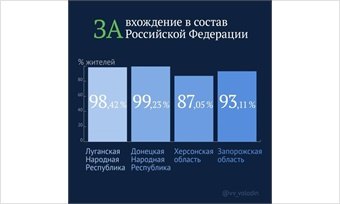 Результаты стали известны уже на следующее утро. Так, субъектом РФ хотят стать в ДНР 99,23% жителей, в ЛНР — 98,42%, в Запорожской области — 93,11%, а в Херсонской области — 87,05%.