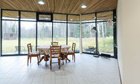 Дом максимально интегрирован в окружающую среду, визуально спрятан в глубине холма. Большая часть стены по периметру – панорамное окно со стеклами, удерживающими тепло. Смотровое окно есть и в потолке, таким образом, сидя у камина, можно любоваться и пробегающими облаками, и вековым лесом.